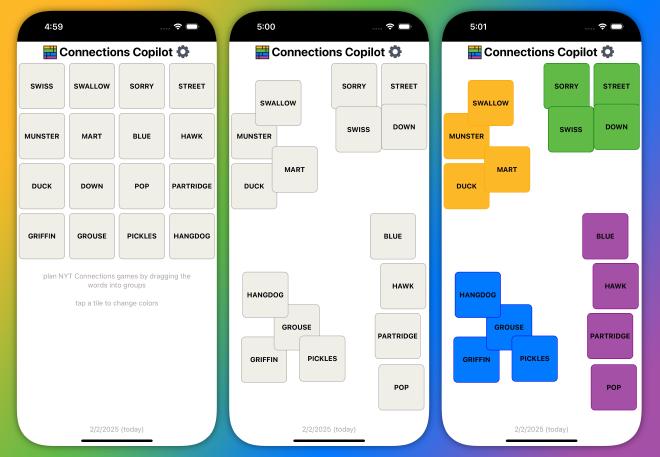 I decided to play around with a small web app I call Connections Copilot which reads the daily game from the NYT website, and displays the words as tiles in a similar way to the Connections game. But instead of letting you play the game and enter your answers, it only lets you drag them around, allowing you to visually put them into groups to help you think it through. Once you’re done planning, you head over to the real NYT Games app or website and enter your answers in hopes of getting a perfect game 🟨 🟩 🟦 🟪!